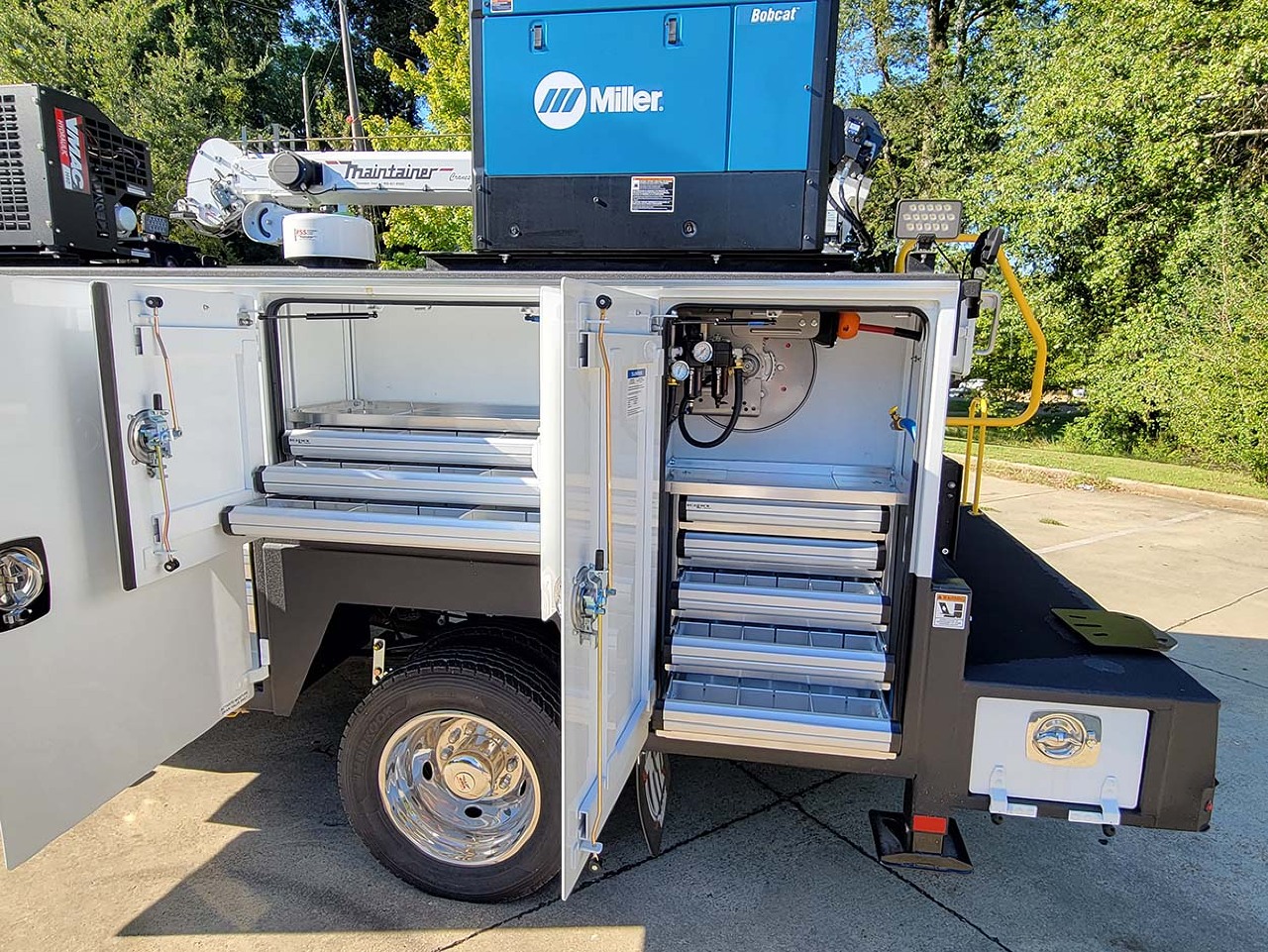 FOR SALE IN MERIDIAN, MS, WE HAVE A BRAND-NEW 2024 DODGE RAM 5500 4X4 REG CAB EQUIPPED WITH A 11' MAINTAINER SIG 1 SERVICE BODY. THIS IMPRESSIVE TRUCK FEATURES PRESSURIZED COMPARTMENTS, A 26-INCH STEEL WORKBENCH BUMPER, AND A PROTECTIVE SPRAY COATING. ** BODY SPECS: 24 BOOM LENGTH: THE TRUCK BOASTS A 24-FOOT BOOM WITH A 7,000-POUND CAPACITY SHORT TOWER CRANE. THIS CRANE COMES COMPLETE WITH A PLANETARY WINCH AND A WIRELESS REMOTE FOR EFFICIENT OPERATION. VMAC H40 40CFM ROTARY SCREW AIR COMPRESSOR: PERFECT FOR POWERING PNEUMATIC TOOLS ON THE GO. TOOLBOXES: FOUR TOOLBOXES PROVIDE AMPLE STORAGE SPACE FOR EQUIPMENT AND SUPPLIES. BOLTS BINS: KEEP YOUR BOLTS AND SMALL PARTS ORGANIZED WITH THE INCLUDED SET OF BINS. BATTERY-POWERED TOOL STORAGE: CONVENIENTLY STORE AND CHARGE YOUR BATTERY-POWERED TOOLS. INVERTER: POWER ELECTRONIC DEVICES WHILE ON THE JOB. HYDRAULIC OUTRIGGERS (UP/DOWN AND EXTENSION):ENSURE STABILITY DURING CRANE OPERATIONS. WORK LIGHTS: FACING SIDES: ILLUMINATE YOUR WORKSPACE FOR SAFETY AND EFFICIENCY. REAR AND BOOM TIP (FACING DOWN): ENHANCE VISIBILITY DURING NIGHTTIME OR LOW-LIGHT CONDITIONS. STROBE LIGHTHEADS: FRONT GRILL: IMPROVE VISIBILITY TO OTHER DRIVERS. RECTANGULAR STROBES (REAR BUMPER): ENHANCE SAFETY ON THE ROAD. HEADACHE RACK WITH LIGHT BAR: PROTECT THE CAB AND PROVIDE ADDITIONAL LIGHTING. STROBE LIGHTS AND BRAKE LIGHTS: ENSURE VISIBILITY AND COMPLIANCE WITH REGULATIONS. TORCH REEL AND 3/4 AIR LINE IS PLUMBED DIRECTLY FROM THE AIR TANK TO THE REAR OF THE BODY. BOBCAT 265-AMP MACHINE WITH 9500 WATTS CONTINUOUS GENERATOR INCLUDES 50’LEADS, GROUND CLAMP, ELECTRODE HOLDER, AND QUICK DISCONNECTS. MAINTAINER M-CONNECT. UNDERBODY LIGHTS.